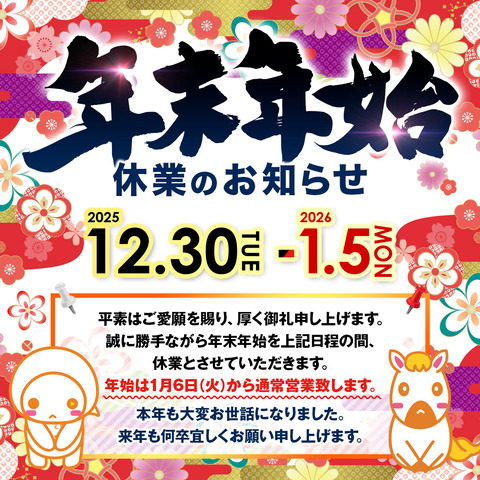 平素は格別のお引き立てをいただき厚くお礼申し上げます。 弊社では、誠に勝手ながら下記日程を年末年始休業とさせていただきます。